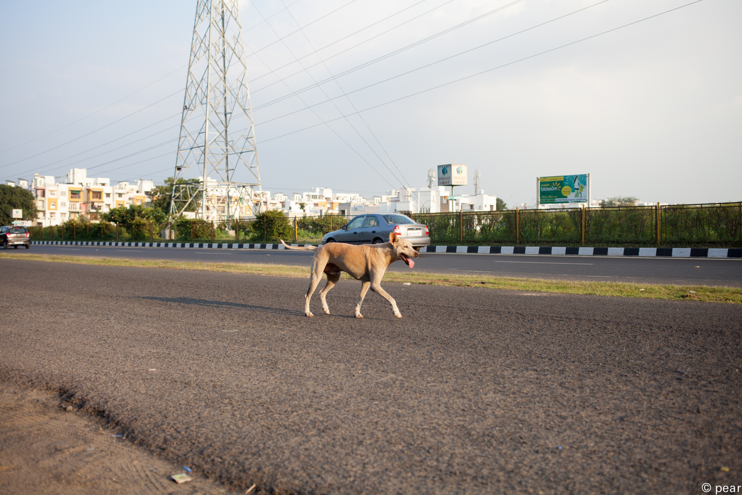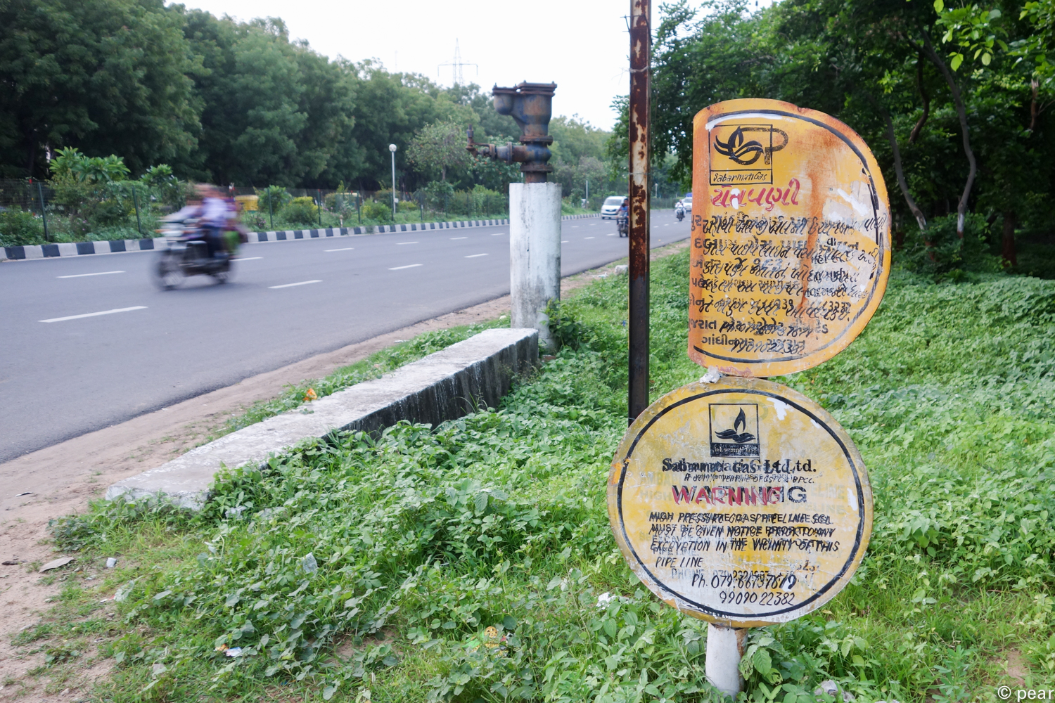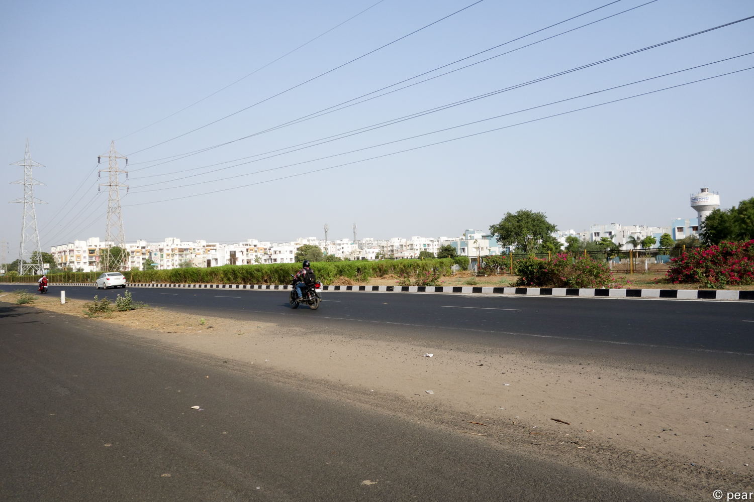 こちらの写真は、州都ガンディナガルの道。4車線道路がひたすら続き所々ラウンドアバウト(イギリス式の円形交差点)で結ばれています。注目すべきことは道路のコンディションがとてもよく、乗用車がそこそこのスピード(80Km/h)で走行しても、揺れたり跳ねたりして天井で頭を打つようなことはありません。