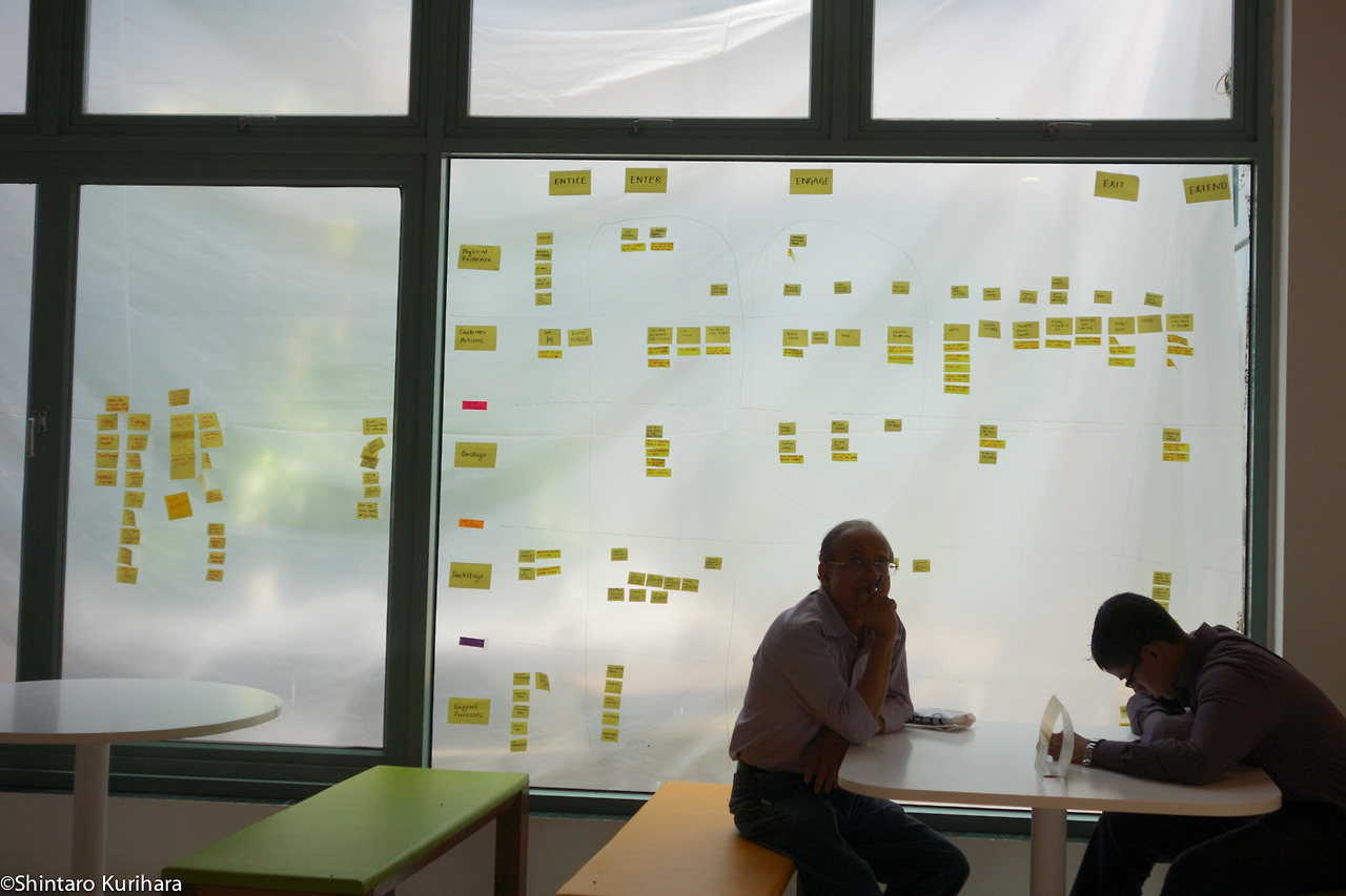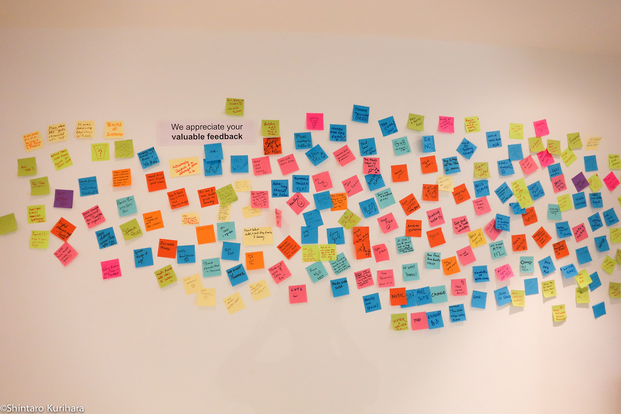 食事をとるスペースとともに、アイデア出しが活性化するような打ち合わせ場所や作業スペースも確保されています。そこら中にポストイットでブレストを行った形跡が残されています。