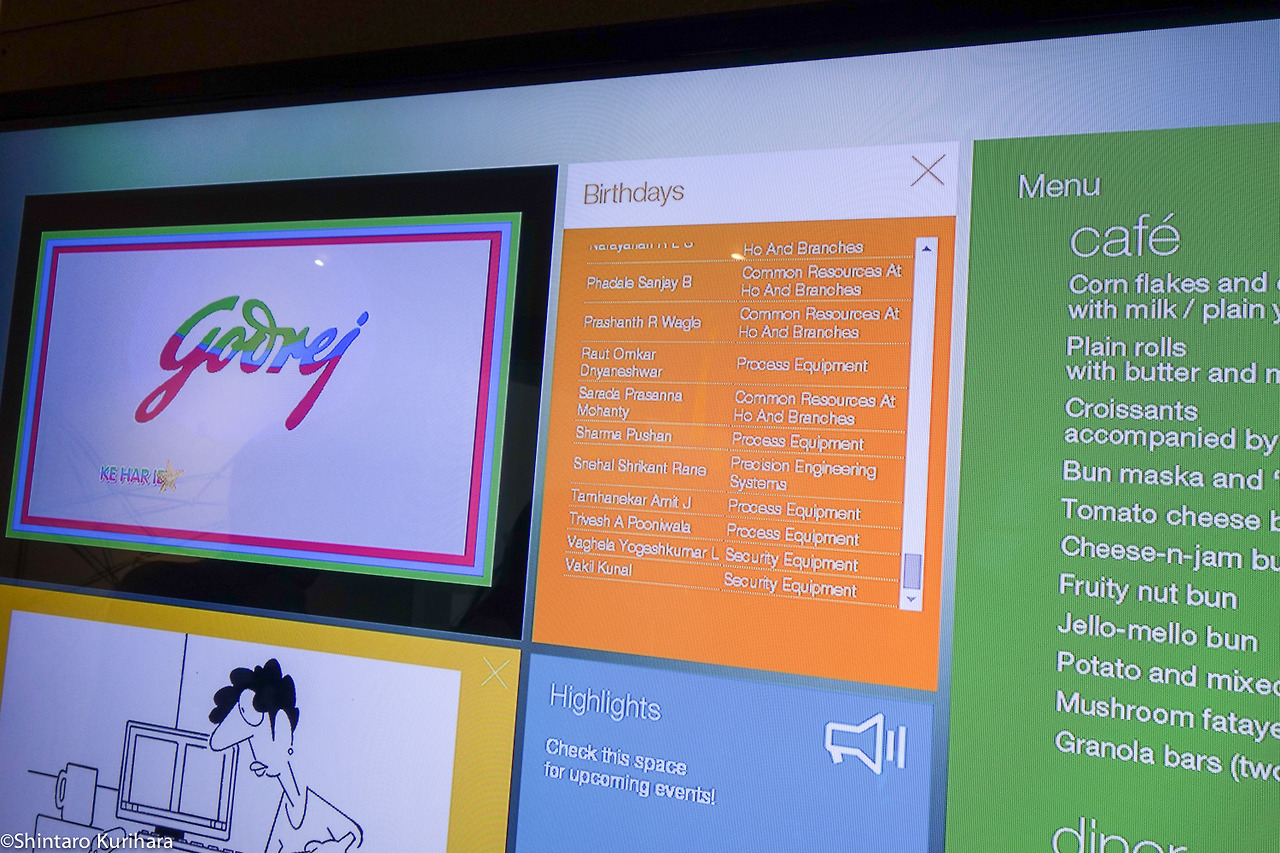 入り口には、巨大タッチパネルタイプのディスプレイがメニュとイベントう情報を表示しています。自由にタッチして情報を調べることもできます。また、誕生日の社員の名前も公開されていました。