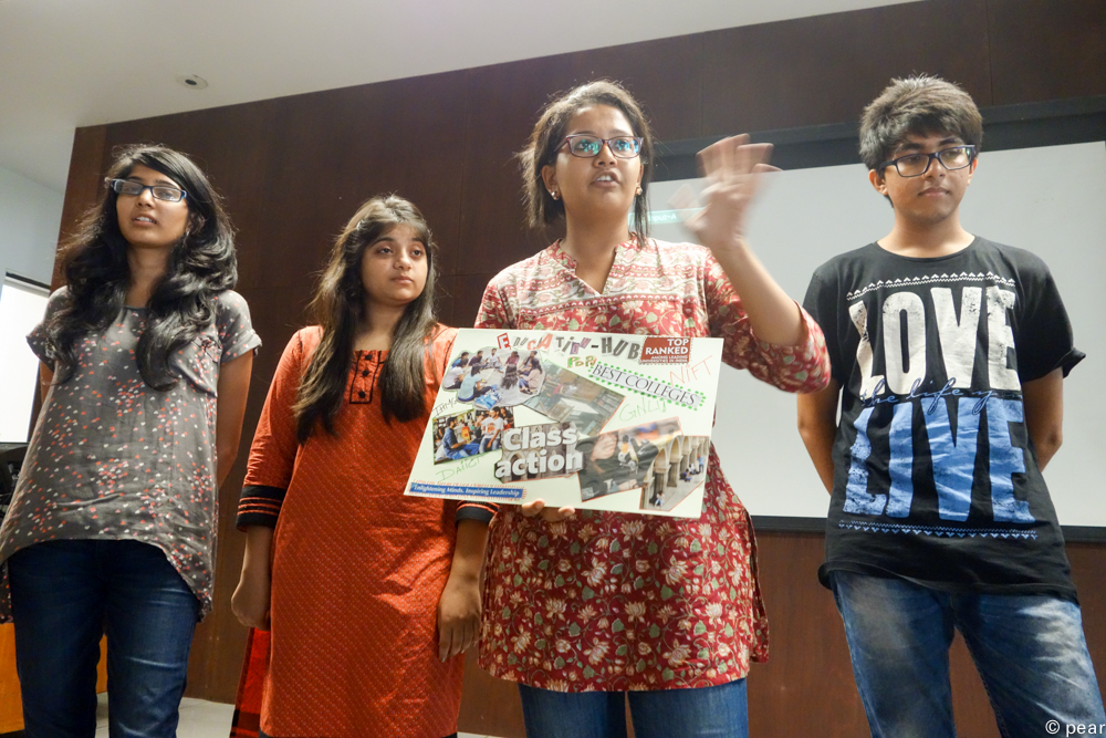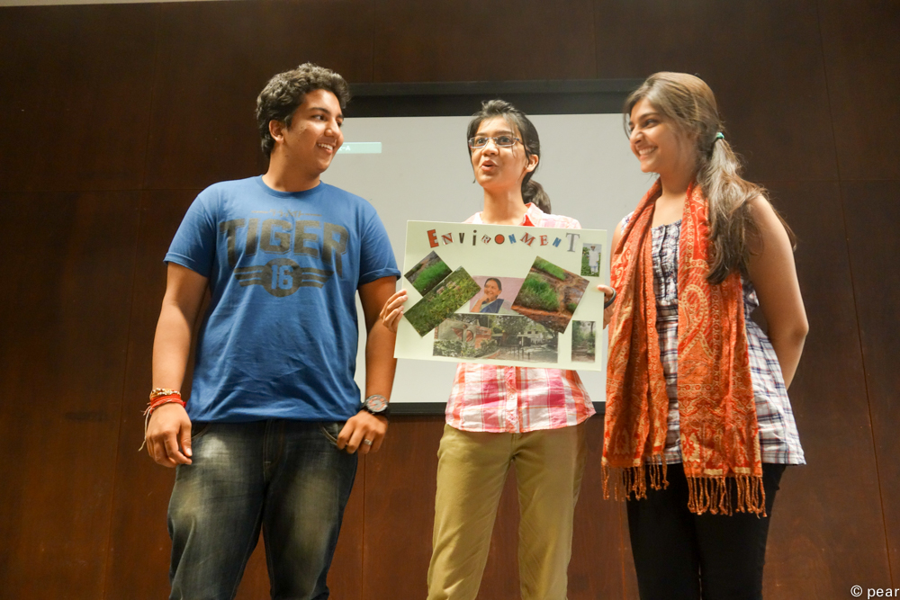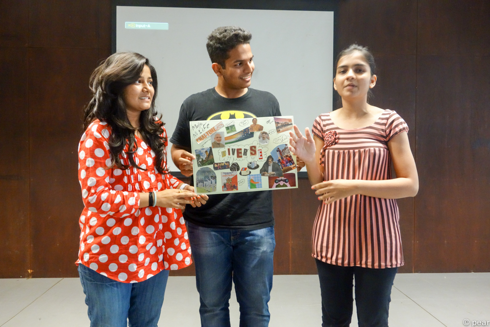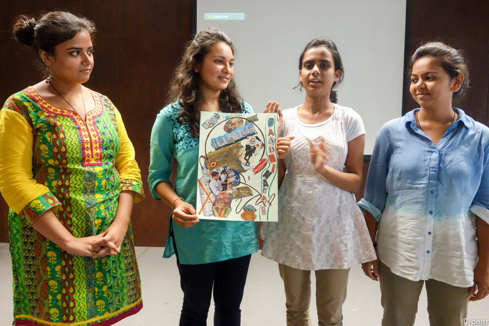 まずは、できあがったコラージュを貼った画用紙だけを見せて、イメージから何が想像されるかを聴衆たちに尋ねるスタイルのプレゼン方法をとりました。そうすることで、意図した内容がちゃんと聴衆に届いているか知ることができます。 インドの学生は、こういうときしっかり反応してくれるので進行がスムーズです。