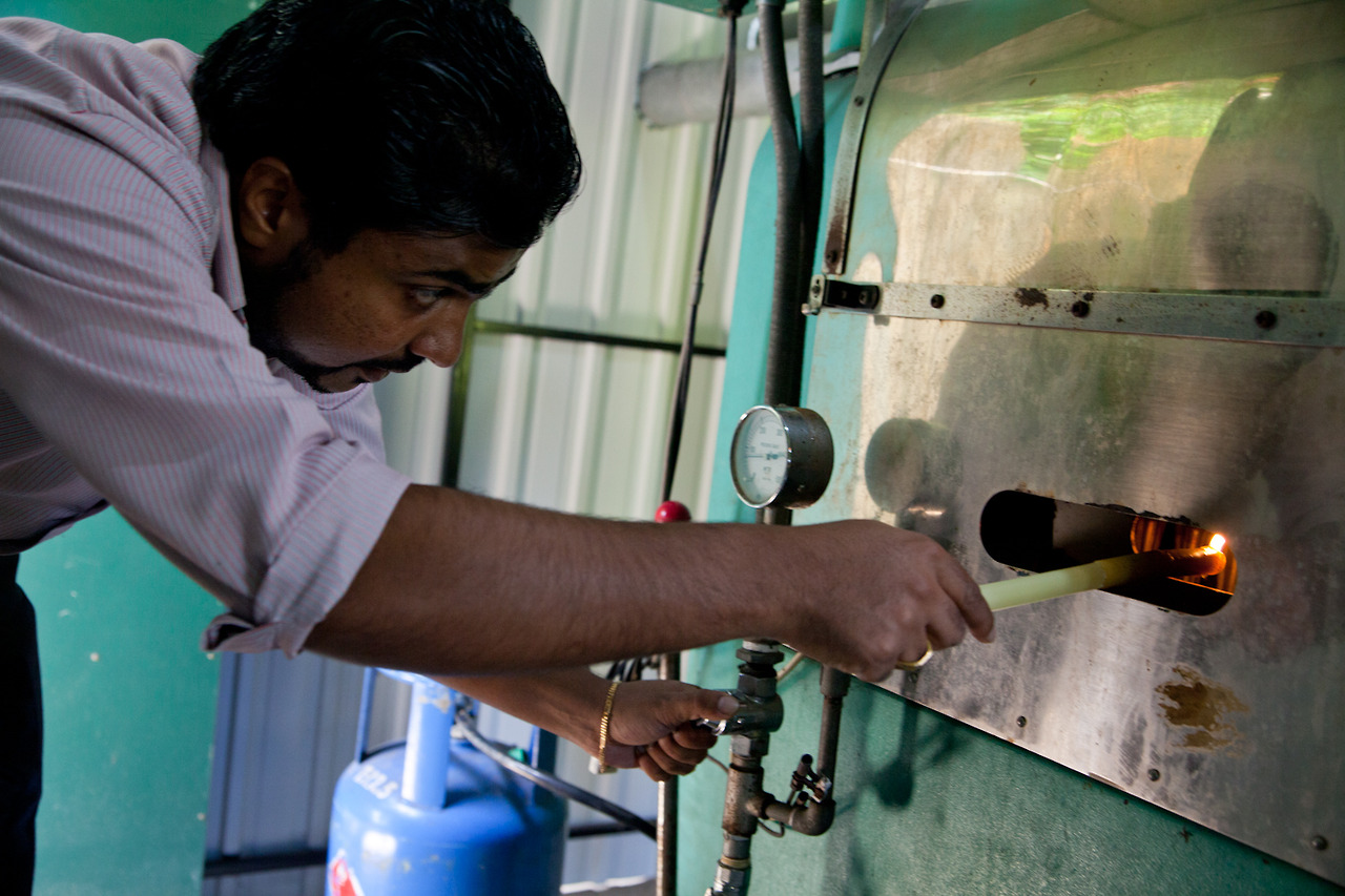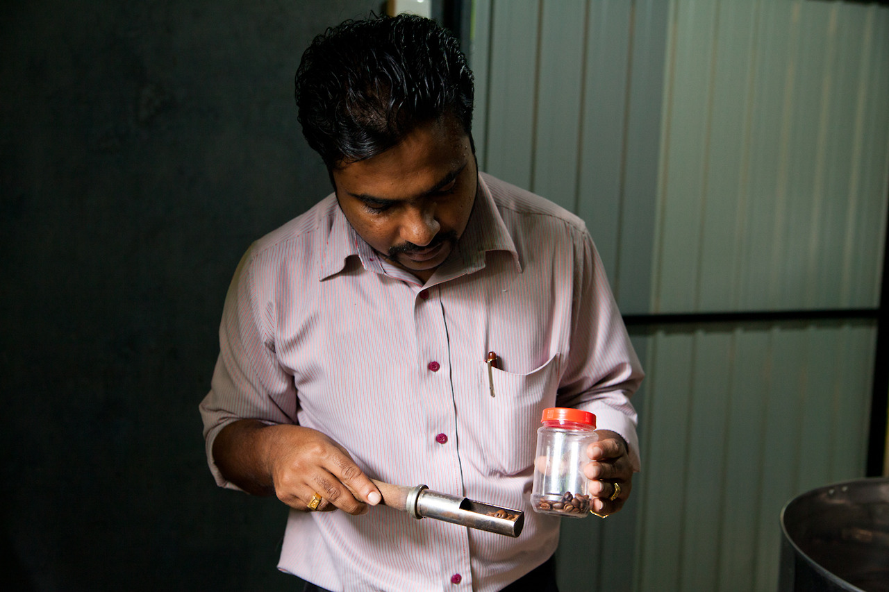 スリランカ天然コーヒーの焙煎。担当者は初めて一人で焙煎ということでひとつひとつ丁寧に確認しながらも迅速に作業進行。ついに、香ばしいコーヒー豆が出てきた。ほっとする香り。今回は、森の天然コーヒーの収穫、加工、消費、還元まで全プロセス追いかける予定。