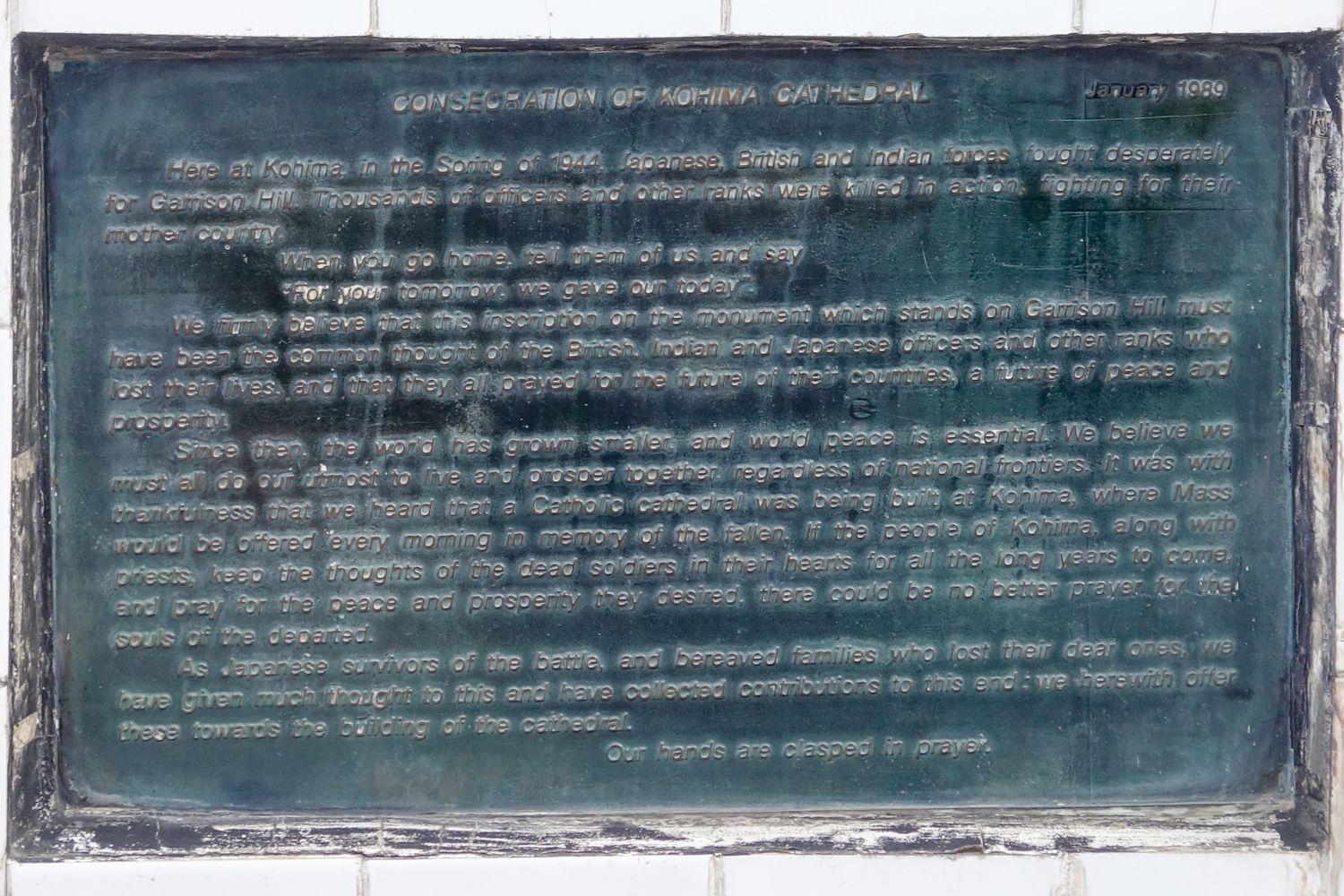 敷地内の碑には「1944年春ここコヒマで、日本、英国、インド軍がギャリソン丘を巡って激しく戦い、将校をはじめとして数千人がこの祖国をかけて生命を落としました」とあります。