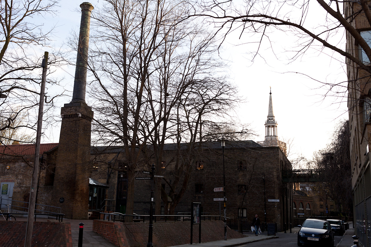 地域研究を兼ねて、ローカル散策ツアーに参加してきました。週2回一人10ポンドで集合場所にいれば参加できます。詳しい人と一緒に歩いて質問するのが地域の歴史を知るのには近道です。雨降りだったのであまり人が来ないかと思ったのですが20人も参加者がいて驚きました。そんなにメジャーな場所ではないですが、遠方から観光客が多かった。1時間ほど歩いて、最終目的地はテムズトンネルのポンプハウス。トンネルを掘る際に漏れ入ってくる水を組みだしていた動力エンジンがあった場所です。
